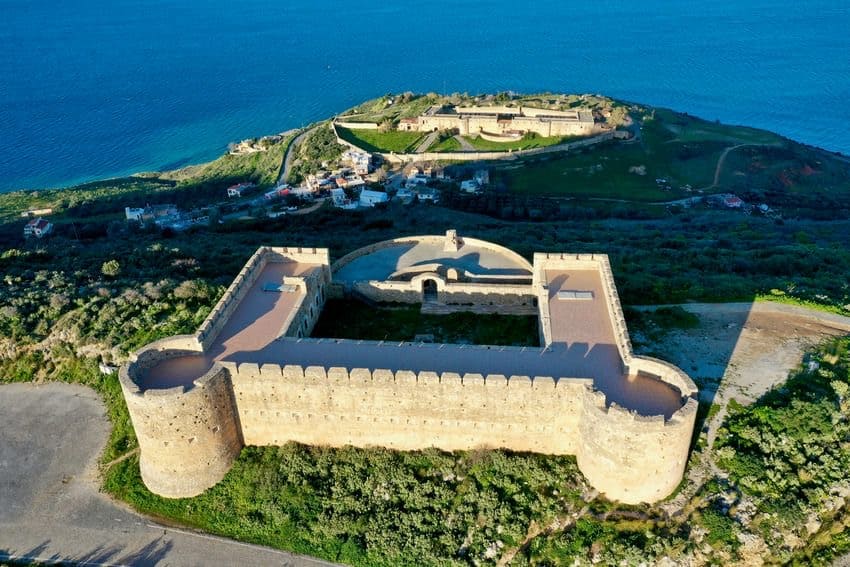Just nearby stands the impressive Koules Fortress of Aptera, often referred to simply as the Koule Fortress. Built during the Ottoman period in the 19th century, this stronghold was constructed to control the strategic entrance of Souda Bay.